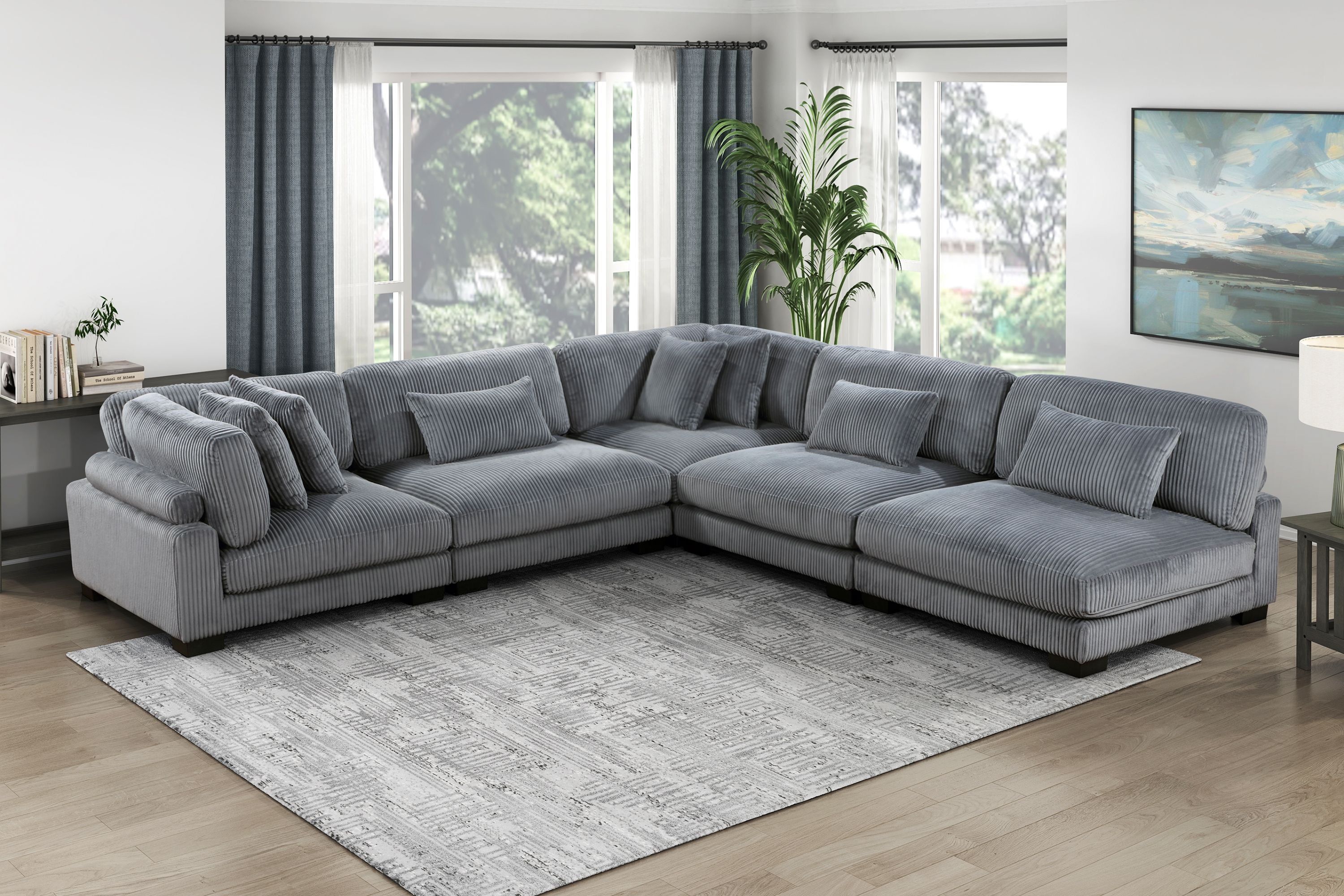 Configurable to your available space, the Traverse Collection allows for the addition and detachment of pieces for a customized seating experience. The gray corduroy fabric upholstery creates a plush expanse for a soft touch experience. The armless chair features a lumbar pillow, and reversible cushions.PRODUCT DIMENSIONS: Overall Dimension: 45" x 45" x 34.5"HSeat width: 45"Seat depth: 30"Seat height: 17"Pillow diamension: 26x15: (1)Listing Includes: One Armless Chair Only.Ottoman & Corner Seat: Not included.Simple Assembly RequireYOU CAN CREATE MANY VARIATIONS OF MODULAR SECTIONALS GIVEN IN IMAGES.