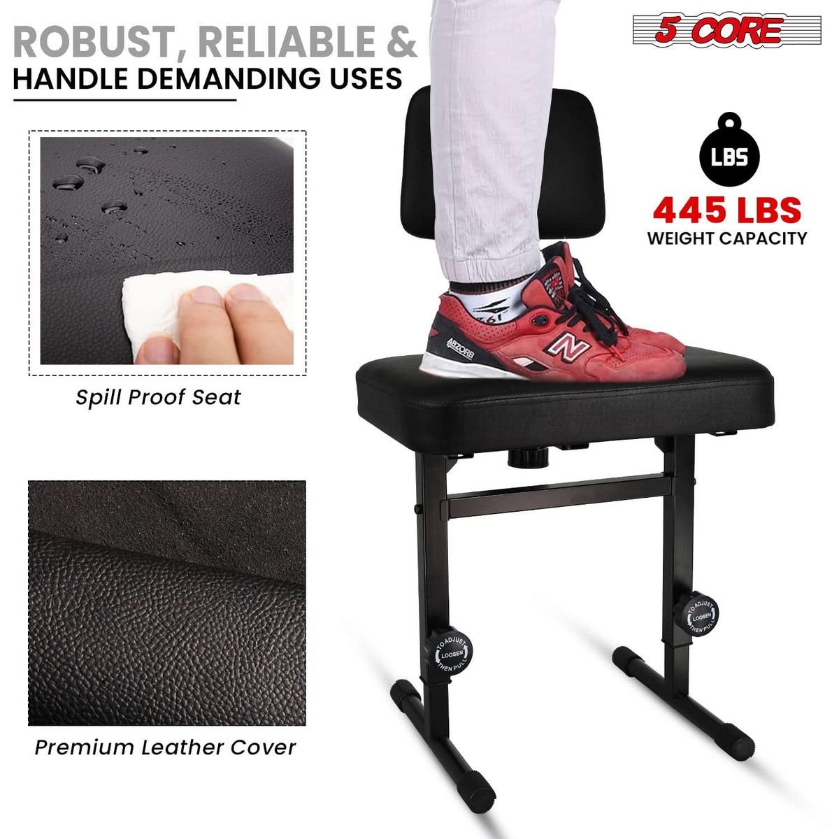 | Experience plush comfort and support with our adjustable piano bench, designed for both professionals and learners. The 12.5 x 18 inch wide seat with a 3 inch thick padded sponge cushion ensures long lasting comfort during extended practice or performances. With a weight capacity of 445 lbs, this beginner friendly musician chair offers durability and stability. The adjustable height (17.5" to 22) and wide backrest provide fantastic support tailored to your needs. Built from metal alloy, tough ABS, leather, sponge, and sturdy wood board, this piano stool combines strength and style, making this piano chair the perfect addition to any professional piano setup. |