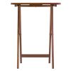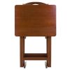 Make entertaining simple and easy with the Alex 5-Piece Snack Table Set. Constructed of Solid Wood; this stylish set includes four foldable tables with X-frame bases and a convenient storage stand. The tables have gently curved sides and rounded corners and are ideal for setting out appetizers at the big game or for grabbing a meal while relaxing on the sofa. Finished in a rich Walnut that brings out the natural wood grain. Tables fold in an instant for easy storage.