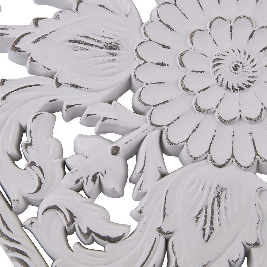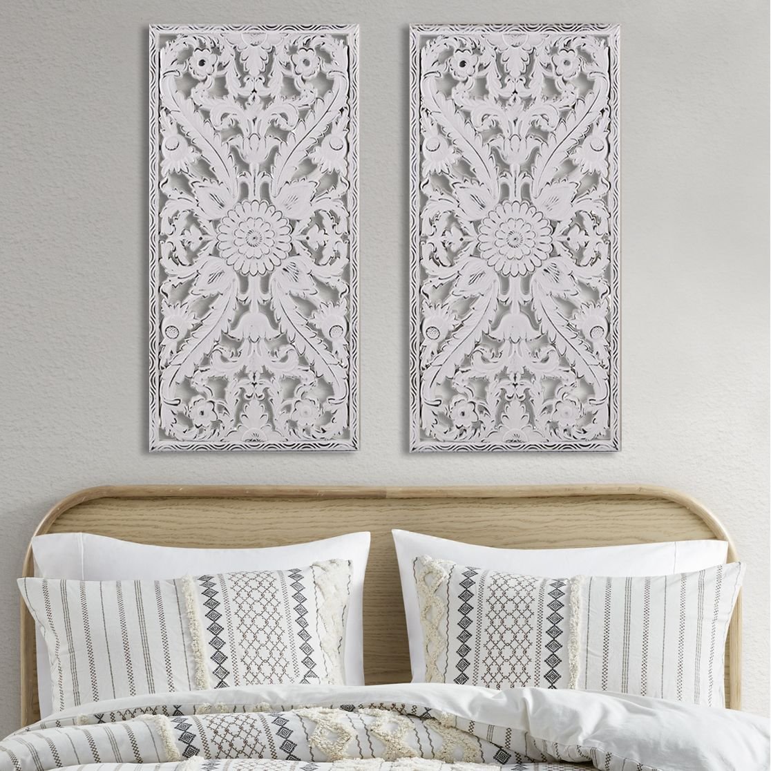 Complete your home decor with our Madison Park Botanical Panel Distressed Carved Wood 2-piece Wall Decor Set. This wall decor set features exquisite carved global botanical designs in a durable MDF material creating beautiful texture and dimension, while a white washed finish adds a unique vintage touch. Each piece is finished with two D-rings on the reverse making it easy to hang pieces, either side by side for a more clean look or staggered for a more stylized approach. Perfect for any Living Room, Dining Room, or Entry way - this carved wood panel 2 piece set is the perfect elegant touch to any decor.