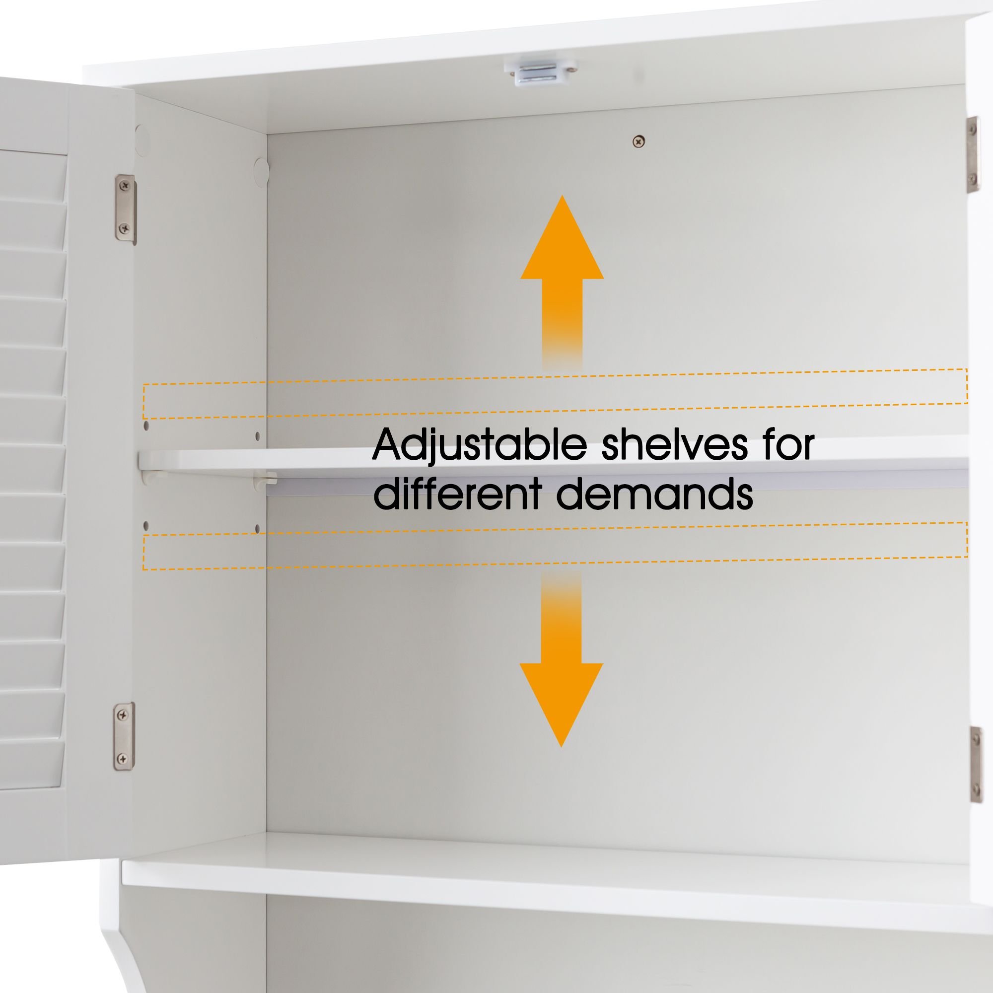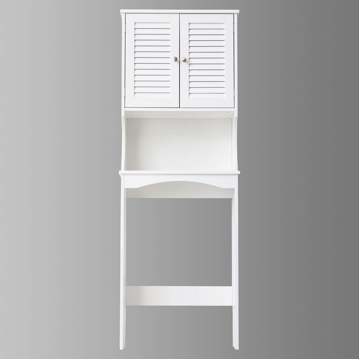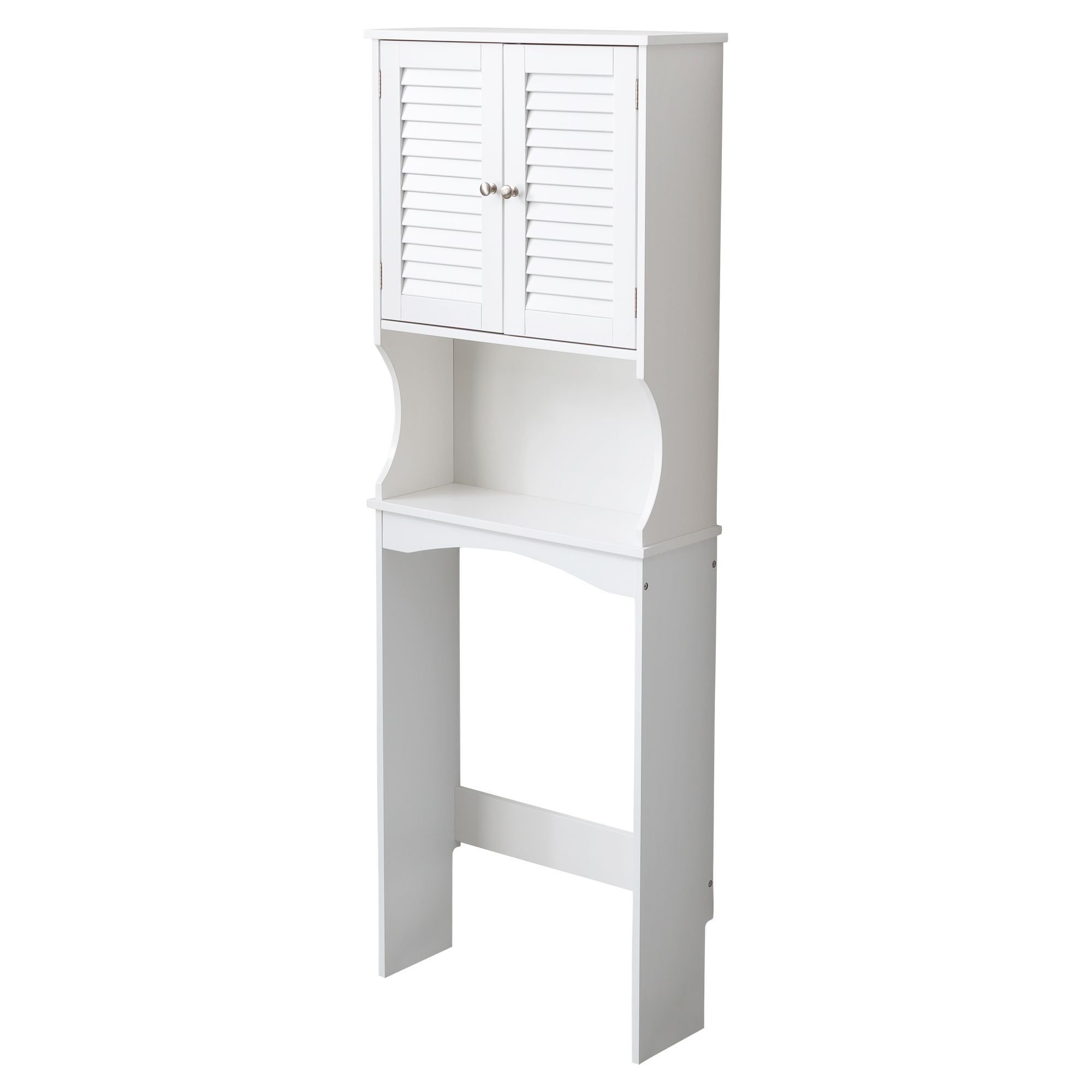 This over the toilet storage cabinet offers practical storage and easy access with 180-degree fully open hinges. The shutter-style doors and matte white finish provide a clean, timeless look. Secure your space with the built-in anti-tip design and pre-drilled screw holes for added stability. Adjust the three-speed shelves to fit your needs, while bright silver handles and door stops ensure smooth operation. The heightened open frame design creates extra storage above your toilet, maximizing space. With attention to detail in paint treatment and screws, this tall over the toilet storage cabinet is both functional and reliable.