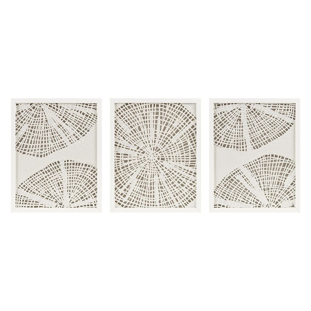 For a subtle coastal touch, the Madison Park Solana Framed Abstract Coastal Rice Paper 3-piece Shadowbox Wall Decor Set is the perfect addition to any decor. Each shadow box features an abstract costal motif made out of handmade rice paper in an off white tone, for a natural and unique design. Finished under glass with a white frame detailing for a gallery look and feel, each piece also features 2 D-rings on the reverse making this 3 Piece set easy to hang in any space. Simply hang this set together for a large focus wall decor or hang pieces separately to fit any space and tie a room together. Spot clean only.
