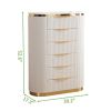 This 5-drawer chest, elegantly finished in white and gold lacquers, offers a lavish addition to any bedroom decor. It features unique drawer handles that add a distinctive touch, while the golden accents underscore its luxurious appeal. The chest is designed with practicality in mind, equipped with ball-bearing soft-closing drawers that ensure smooth and quiet operation. This piece not only serves as a sophisticated storage solution but also enhances the room with its sleek design and classic color contrast. Unique golden accents and distinctive drawer handles that enhance its luxurious appeal. Equipped with ball-bearing soft-closing drawers for a seamless and quiet user experience. Finished in white and gold lacquers, showcasing a sleek design and classic color contrast. Offers ample storage with 5 spacious drawers, making it a practical yet elegant addition to any bedroom.
