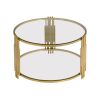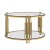 Modern Glass Coffee Table in 31.5", Asymmetrical Metal, Circular Metal Drum Base, Gold Finish & Lower Shelf