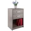 The Winsome Wood Molina 2-Drawer Accent Table features the clean lines of contemporary styling and a mellow ash gray finish. With two roomy drawers and an open shelf; the table offers ample storage. Place it next to your seating in the living room or den to keep remotes and electronic devices within easy reach. Or use it in the bedroom with a table lamp for reading; keeping books and magazine neatly tucked away. Constructed of sturdy composite wood; the unit also makes an ideal addition to a home office where it can serve as a printer stand with paper storage on the lower open shelf and office accessories in the drawers. The wood-grained ash gray finish is complemented by the modern matte-silver plastic drawer pulls. For larger beds; sofas or rooms; try adding one accent table on each end to unify the space (each sold separately). Conveniently packed and shipped in 1 box that includes the hardware necessary for assembling. Replacement part request can be submitted directly to the manufacturer within 60 days from date of purchase.