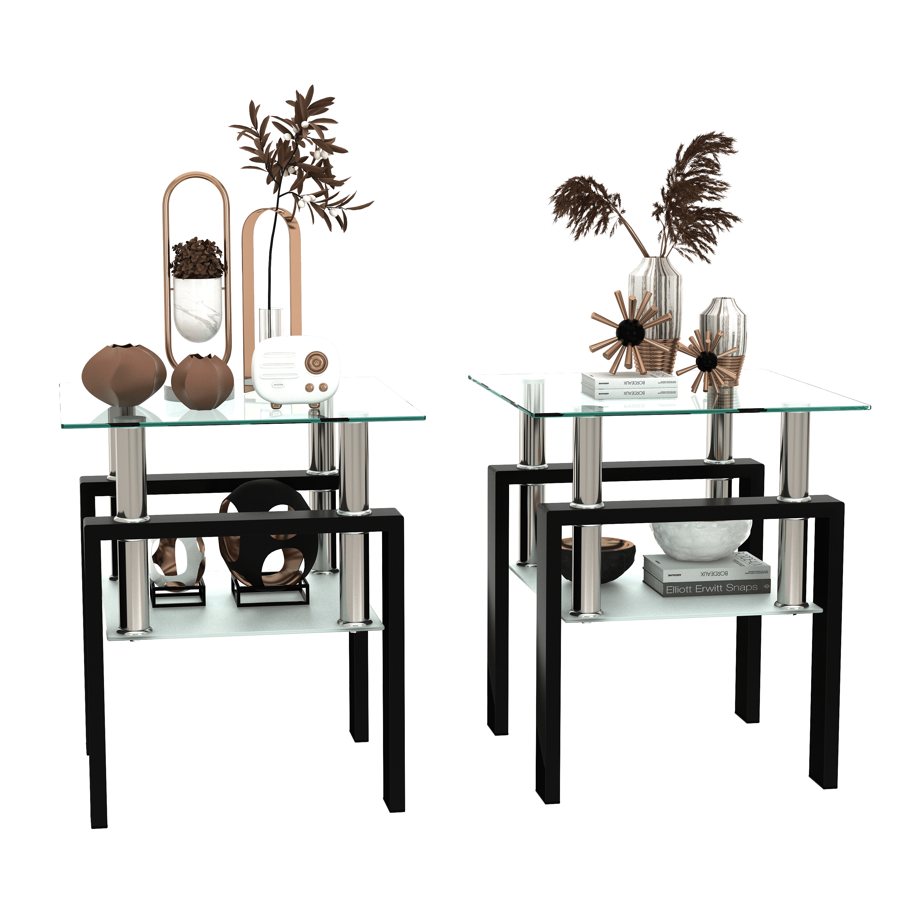 Set of 2, Modern Tempered Glass Tea Table Coffee Table End Table, Square Table for Living Room, Transparent/Black