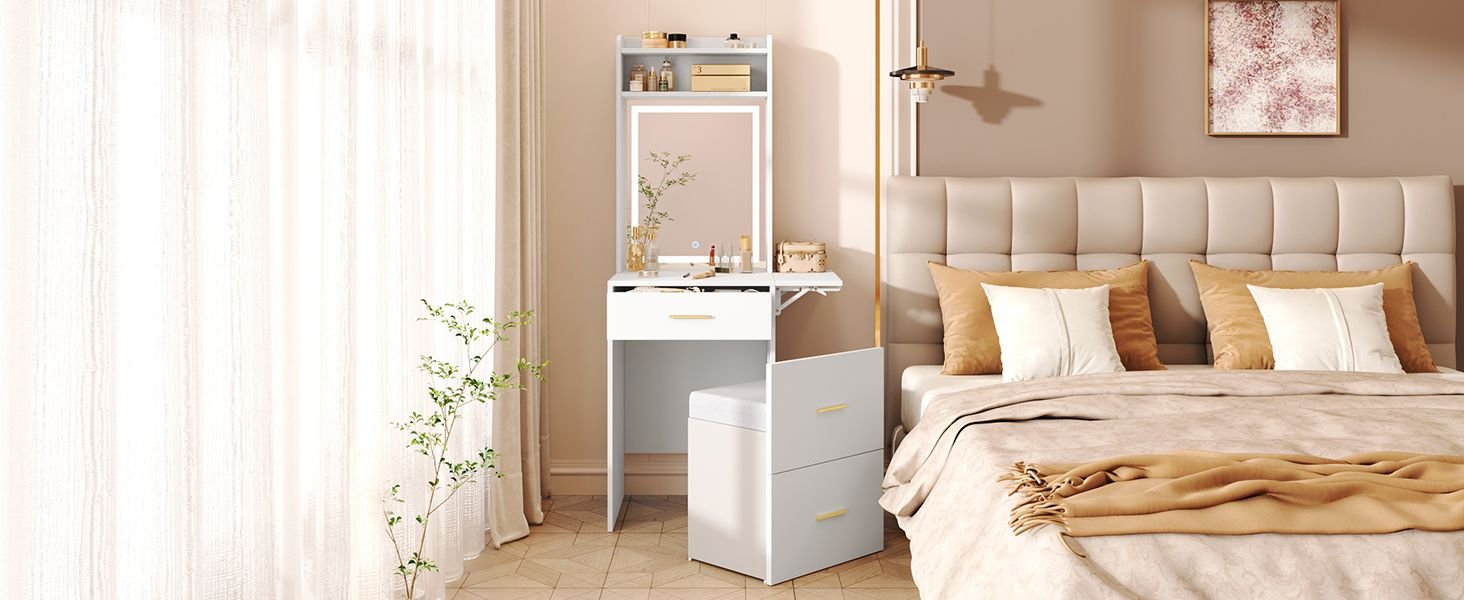 2.Small but Spacious: Despite its small footprint, this vanity offers ample storage with a large drawer and a roomy top featuring shelves above. The foldable side panel adds extra convenience, ensuring all your essentials are within easy reach.