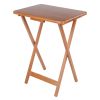 Make entertaining simple and easy with the Winsome Wood Sophia 5-Piece Snack Table Set. A perfect companion piece for a casual meal in front of the TV or on the patio. Four folding snack tables great for daily use and compact enough to store in the closet. An upright stand is an innovative addition to this set as it serves as a rack to store the folded tables discretely when not in use underneath the double-drop leaf top that provides extra table top space when needed. Keep glasses; ice; hors d'oeuvres; and serving dishes on the expanding table top while using the individual folding snack trays for dining. Transport from one room to another as the stand has four plastic casters for easy mobility; 2 of which lock to keep the unit firmly in place. All the tables have smooth; rounded edges and are made of solid wood to last over time with repeated use. Finished in a warm teak finish. Conveniently packed and shipped in 1 box; that includes the hardware necessary for assembling the stand. Tables arrive ready to use and require no assembly. Replacement part request can be submitted directly to the manufacturer within 60 days from date of purchase.
