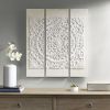 Hang our Madison Park Mandala Triptych 3-piece Dimensional Resin Canvas Wall Art Set on your wall to create a unique focal point in your space. An intricate carving design with the look and feel of wood is made from durable resin, then attached to the embellished canvas and set among each piece of this 3PC wall decor. The embellished canvas is featured in an off white washed tone and purposefully distressed, adding a rustic charm to the look. Globally inspired, this alternative wall decor adds a stunning texture and unique boho touch to any room in your home.