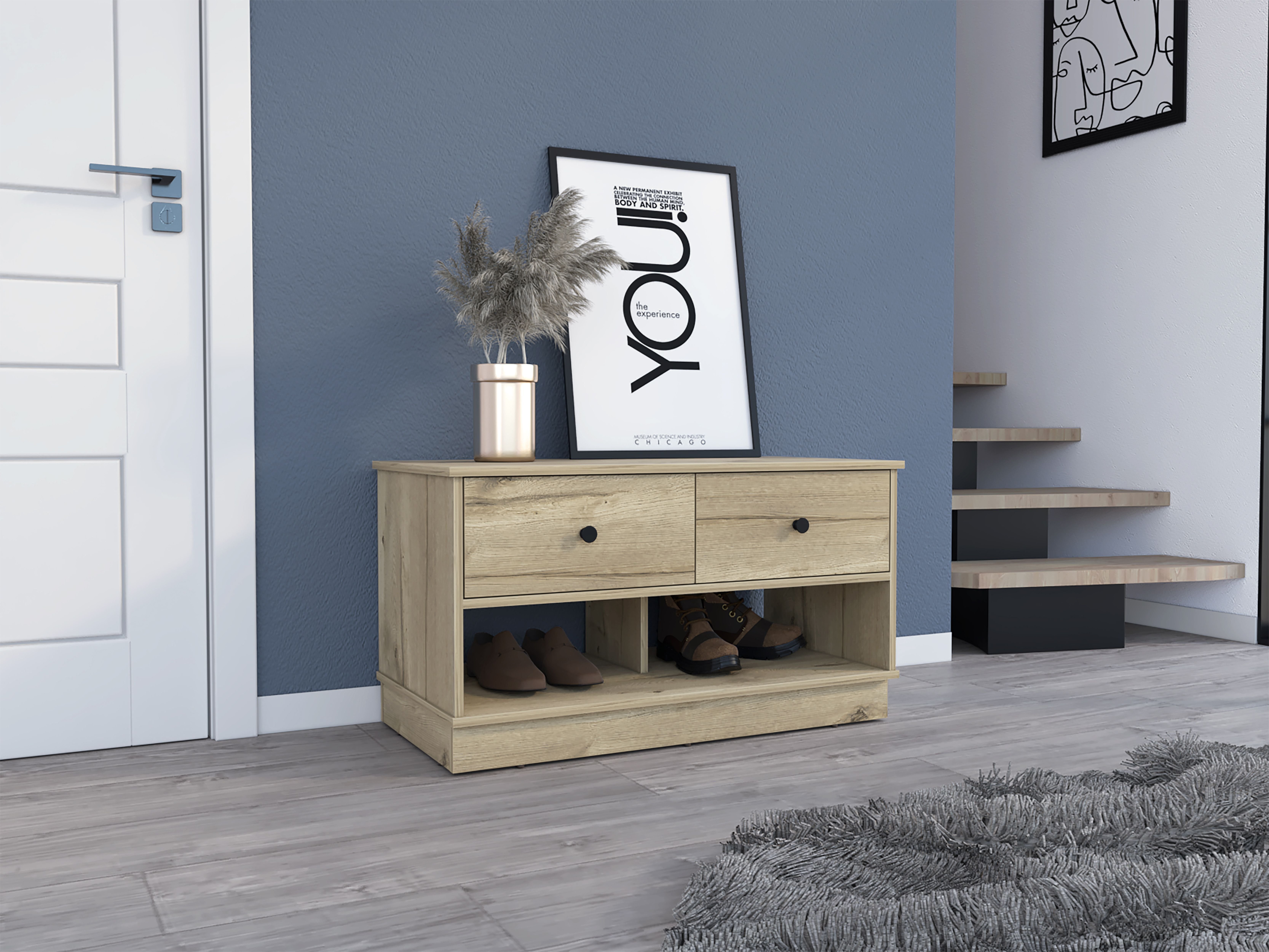 FM FURNITURE Tulip Storage Bench, Two Drawers, Two Shelves ,Light Oak -Living Room"We present the beautiful Tulip Storage Bench. This piece of furniture is perfect for your room or wherever you want to accommodate it. Its excellent and modern design gives a touch of elegance to the space you want to decorate. It is lightweight and very ergonomic. You can store books, notebooks, and many more accessories such as stuffed animals or photographs. It is a piece of furniture that gives life to the space you want to put it. The Tulip storage bench is the perfect replacement if you don't want a traditional nightstand; it achieves the same goal but has a bigger storage space than a nightstand.