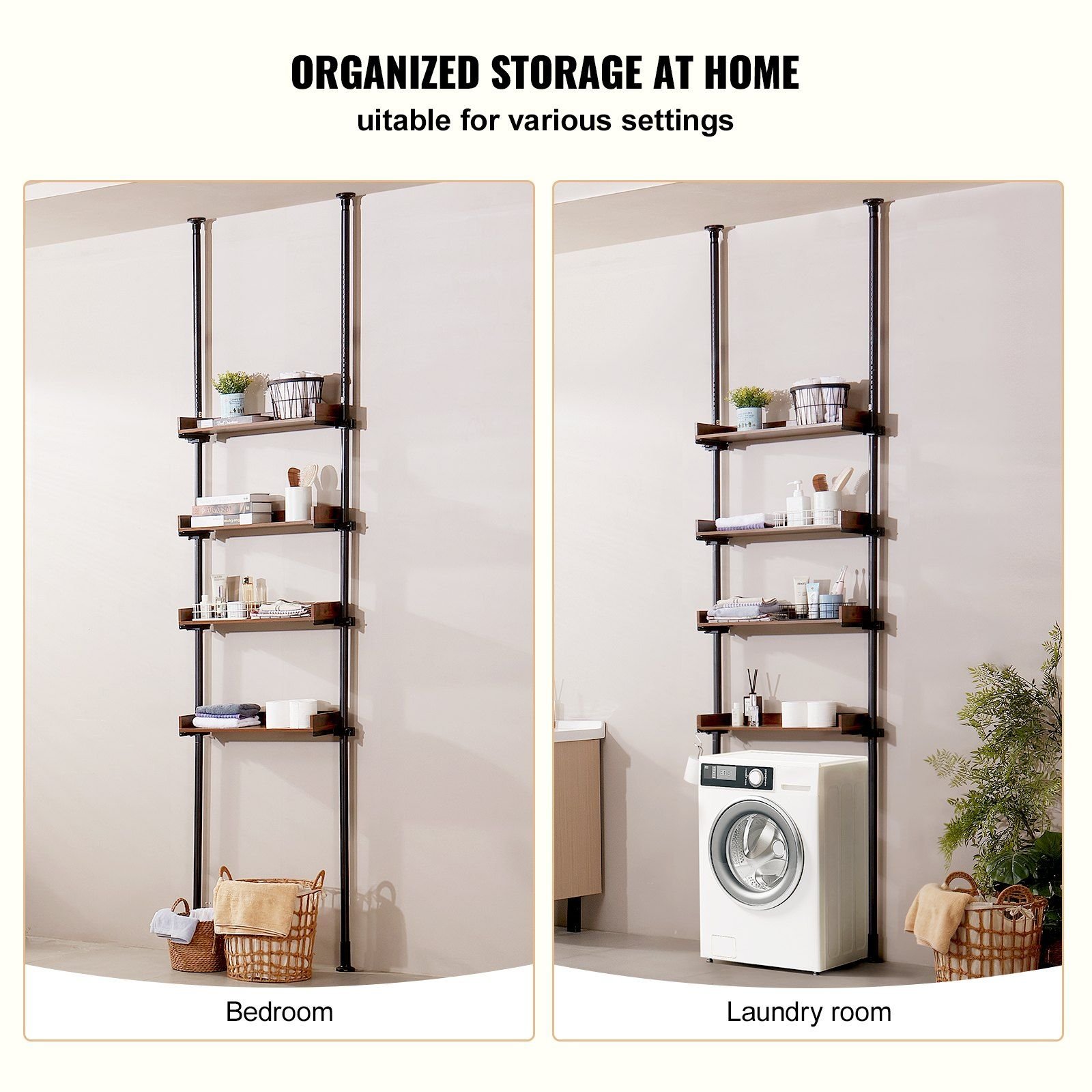 1.Compatible with Most Toilets & Ceilings: This over the toilet storage rack uses a tension floor-to-ceiling pole structure, providing strong support between the floor and ceiling. It comes with one adjustable tube with a spring button, two long tubes, and one short tube that can be freely combined. It fully utilizes vertical space and is suitable for various ceiling heights, even corner beams, blending seamlessly into the bathroom.
